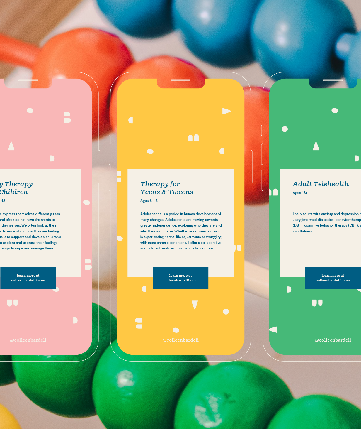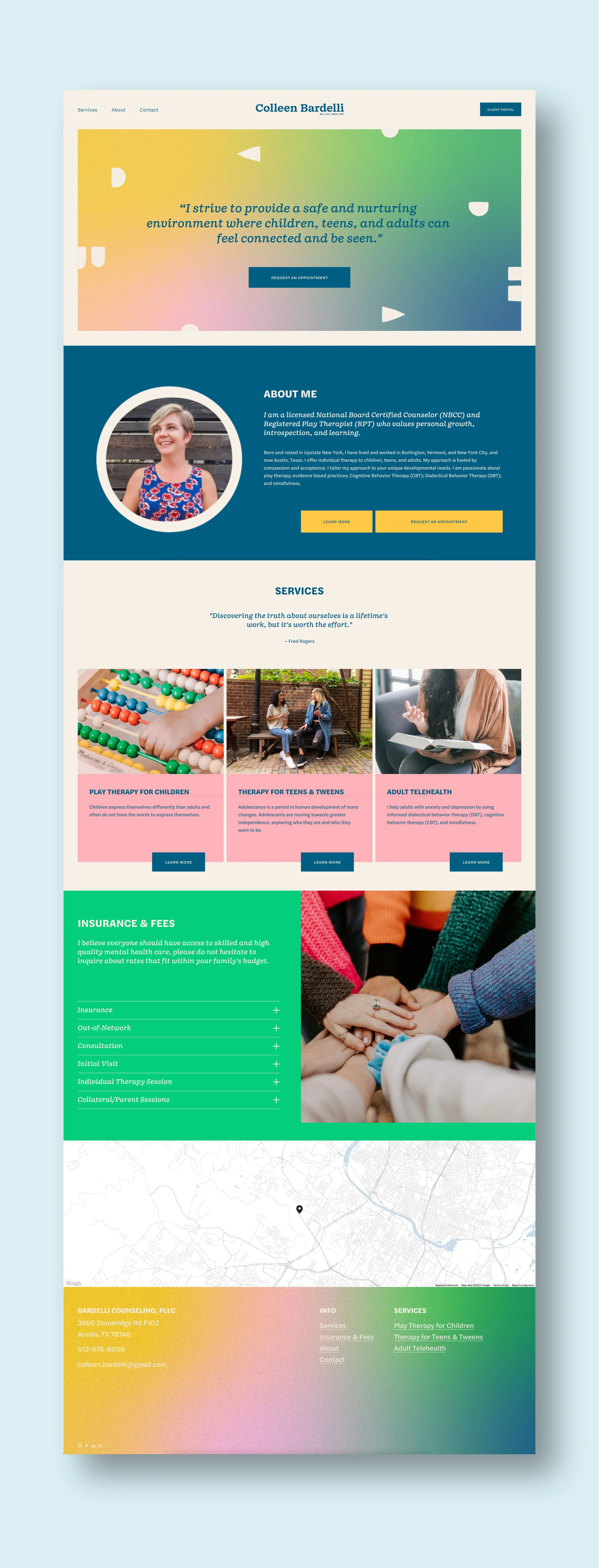 Colleen is a licensed National Board Certified Counselor and Registered Play Therapist. She came to us in need of a rebrand, something that could feel approachable to children as play therapy and teen therapy are a huge focus in the practice, while at the same time be approachable and grown up enough to engage adults who may be seeking therapy or parents who might be in search of a therapist for their child or teen.