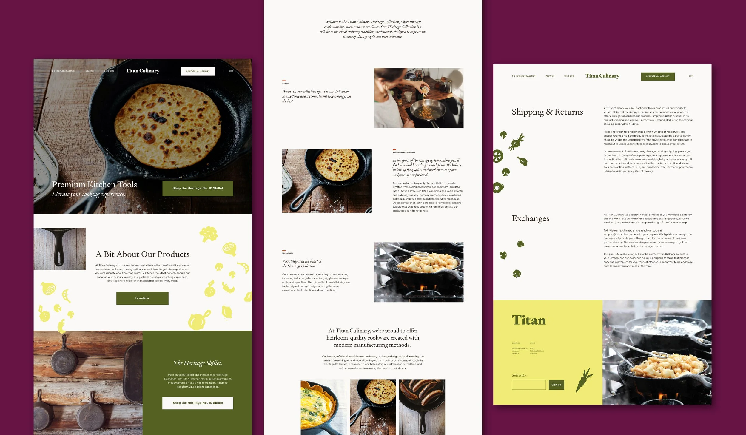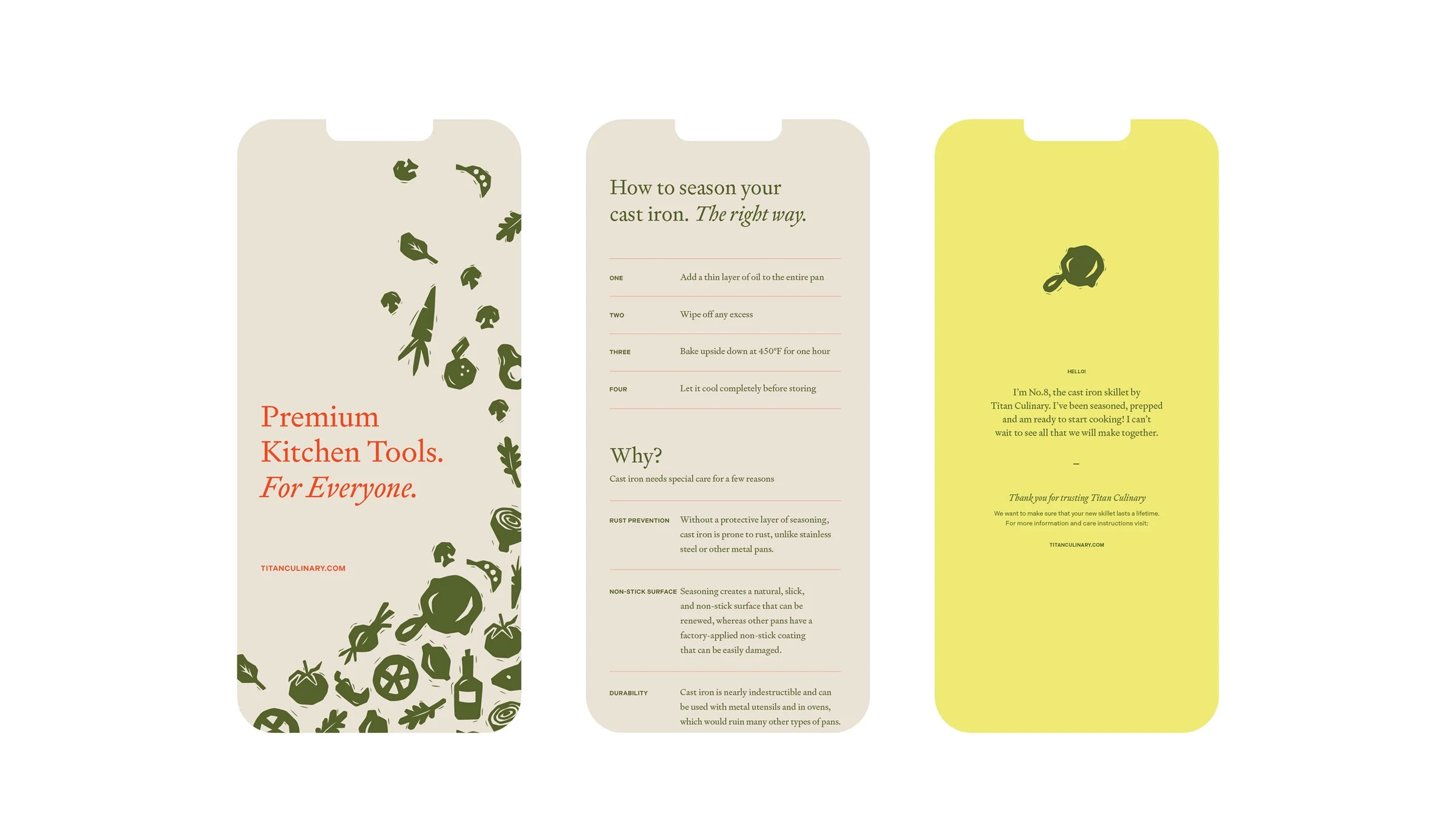 Titan Culinary is a cookware brand built on quality, tradition, and tools that feel good to use every day. We partnered with them from the very beginning, starting with a full discovery phase to uncover what they value, who they serve, and how their story should show up in the world. This work guided the brand identity we created for them: a warm, timeless system with classic typography, bold ingredient illustrations, and a color palette that feels familiar but energizing. The final direction brings together craftsmanship, approachability, and a sense of tradition that makes the brand feel trusted the moment you see it.